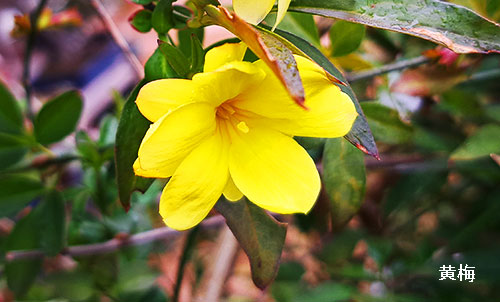 | △黄梅 「梅」という字が入っていますが、梅の仲間ではありません。1つ前の項目でご紹介したように、モクセイ科ソケイ属。こちらは、ジャスミンの仲間と言えます。しかし、ジャスミンと違い、黄梅には香りがありません。 |