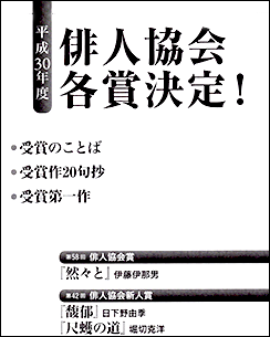 2019/4/30 更新 俳句文学館・第58回俳人協会賞![]() ![]() link ![]() ![]() link ![]() ![]() 自選15 句 ![]() 句集「然々と」帯から。 link ![]() 然々と 伊藤伊那男 ![]() 尺蠖の道 堀切克洋 ![]() ![]() 自選15句 ![]() link 「俳句文学館」2019/3/5 号から掲載致しました。 賞の詳し記事満載です。是非新聞をお求めください。全8ページ・100円。「俳句文学館」発売です。 ![]() △俳句4月号…俳人協会各受賞決定!掲載予定です。2019/3/25 発売。 2019/3/8 更新 NHK俳句1月号△是非お読みください。![]() link ![]() 2019年1月号 ![]() ![]() link ![]() 「旅を詠む」長野 今回の旅は雪景色の伊那・諏訪へ。 凍みる季節の寒天作りや、ざざ虫漁を訪ね、 『古事記』にも残る歴史に触れる。 ![]() 寒天製す・天竜川ざざ虫漁 ![]() 節分会・高遠町/峰山寺。 ![]() 絵島囲屋敷 ![]() 井上井月供養墓…諏訪大社上村本宮 ![]() おすすめ吟行スポット紹介。 「旅を詠む」 全7ページの特集記事。 △素晴らしい記事が掲載されいます。是非、お読みください。 2019/2/10 更新 伊藤伊那男 俳人協会賞受賞![]() ![]() ![]() 拡大します。 ![]() 拡大します。 受賞祝賀会 3月17日 日時 12時 予定 会場 学士会館 東京神田 2019/2/27 更新 ![]() 画像上で拡大します。 ![]() 拡大します。 ![]() リンクします。 句集 「然々と」 伊藤伊那男 第8回北斗賞受賞 句集「尺蠖の道」 拡大します。