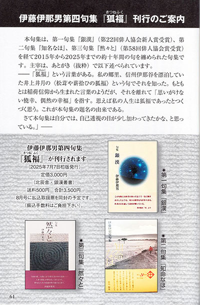 ![]() ホームページへ戻る ![]() △伊東伊那男第四句集『狐福』2025月7月7日発行 ![]() 拡大します。 ![]() linkします。 ![]() 拡大します。2回くりっくして下さい。
